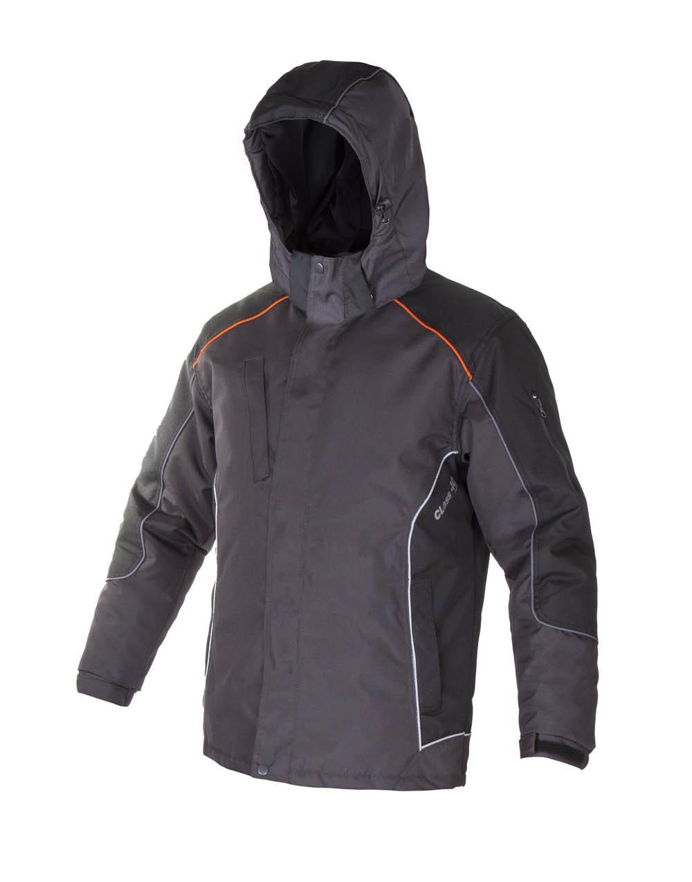 Модель выполнена из водонепроницаемого полиэстера Oxford 300D с полиуретановым покрытием. Куртка имеет современный дизайн в графитовом цвете с черными вставками и контрастной оранжевой отделкой. Множество функциональных карманов и усиления в критических зонах делают её незаменимой для тяжелых условий эксплуатации.
